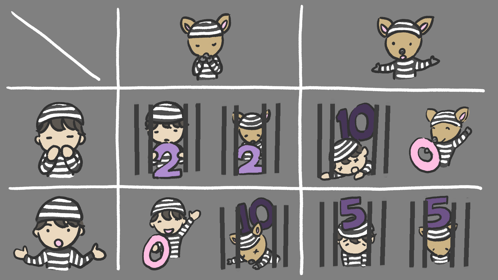なお、それぞれ相手が黙秘か自白のどちらを選択したかはわからない状況であり、話し合うこともできない。